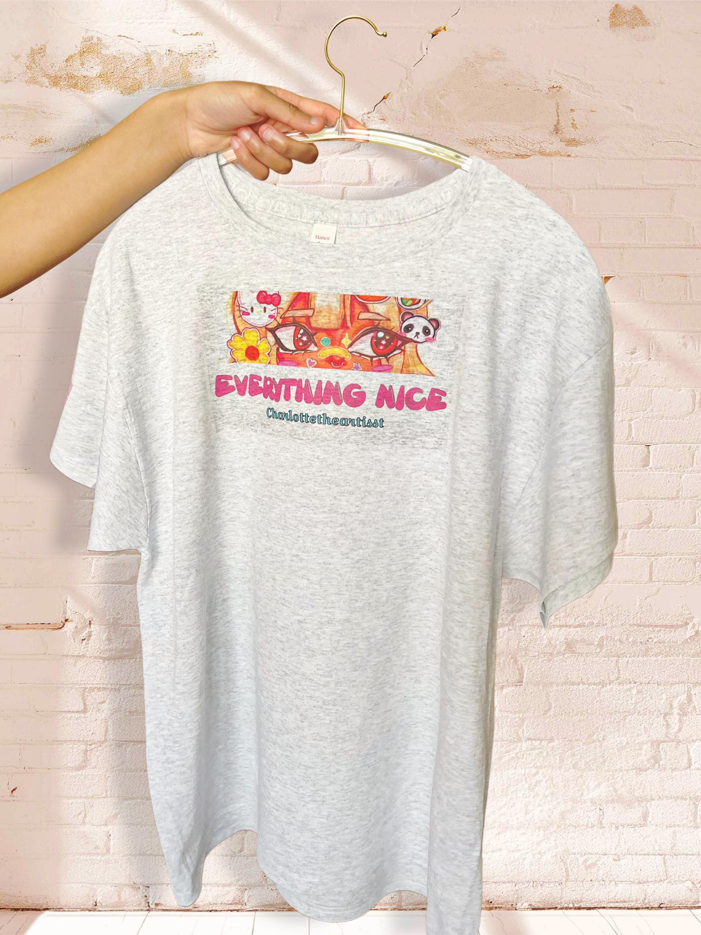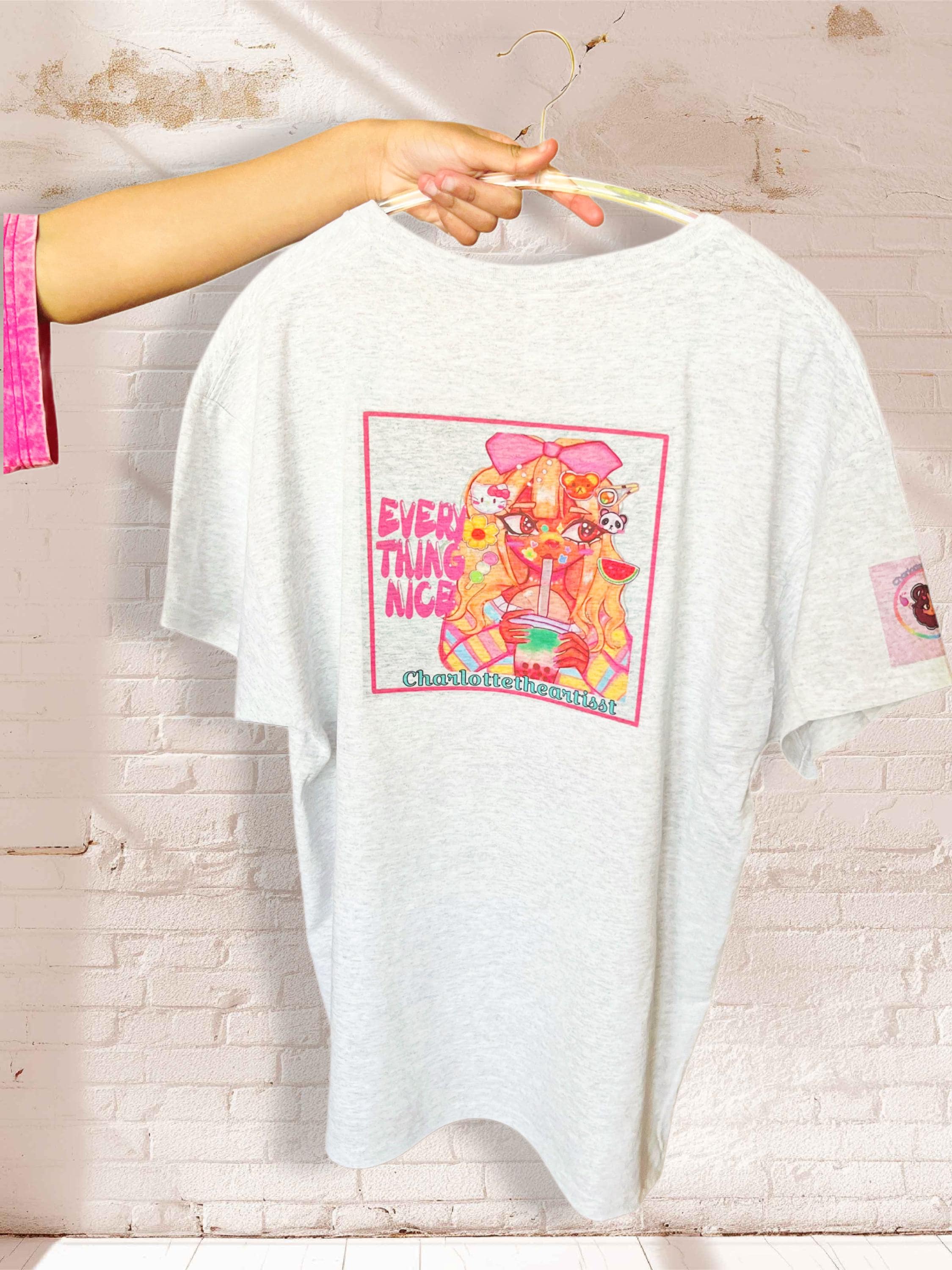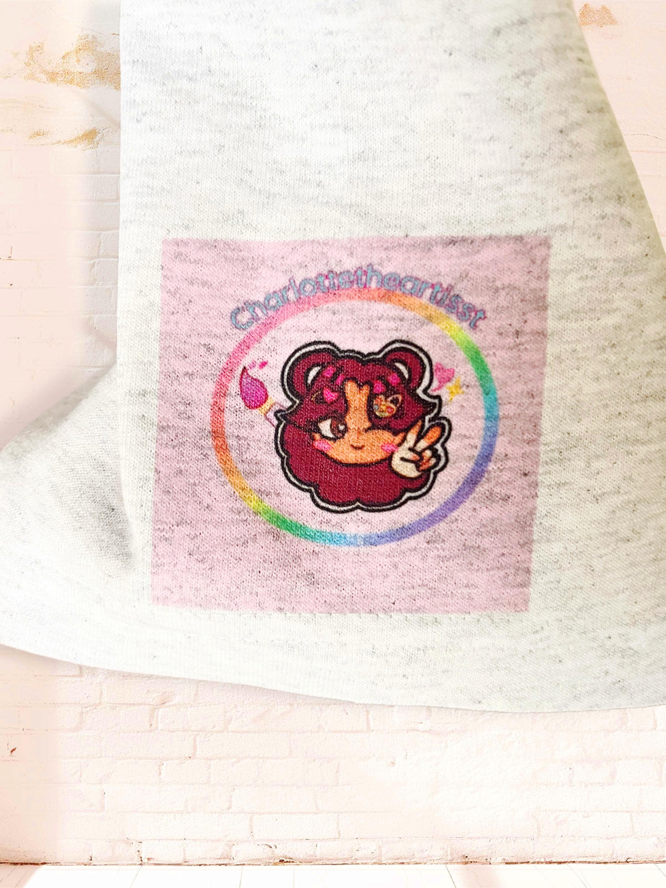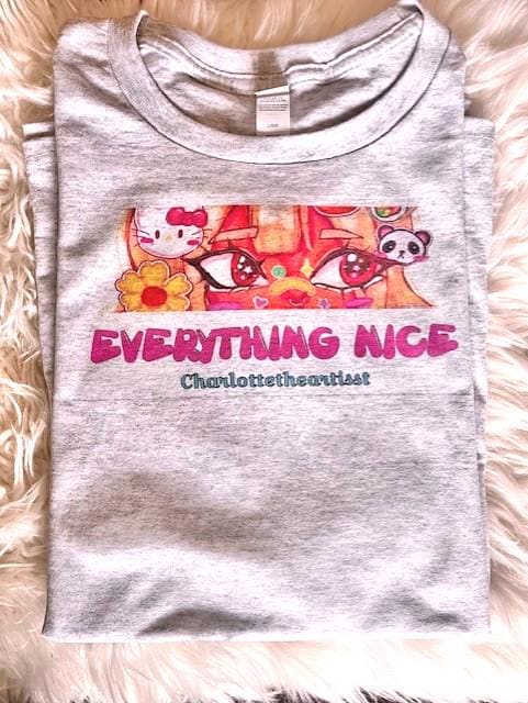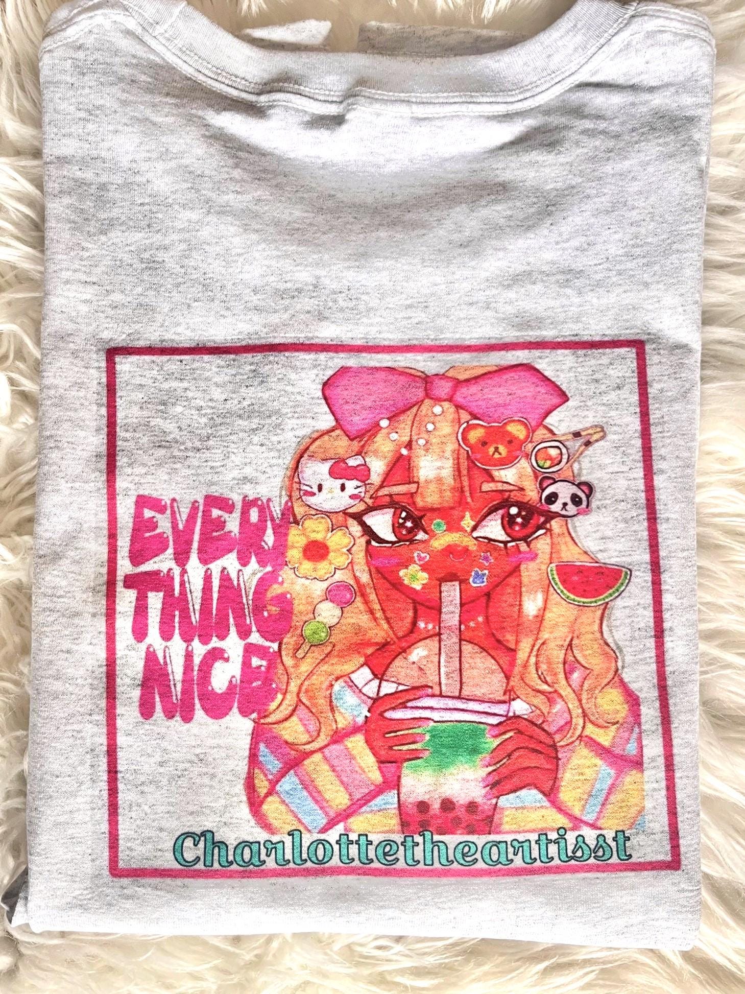 Mizuki is an original character and drawing that I created for an upcoming story I am writing. She is known for her colorful outfits and accessories. The front of t-shirt features a cropped version of Mizuki's eyes and hair accessories as well as my artist tag. The back of t-shirt features the full size drawing along with my artist handle. The right sleeve shows my logo.