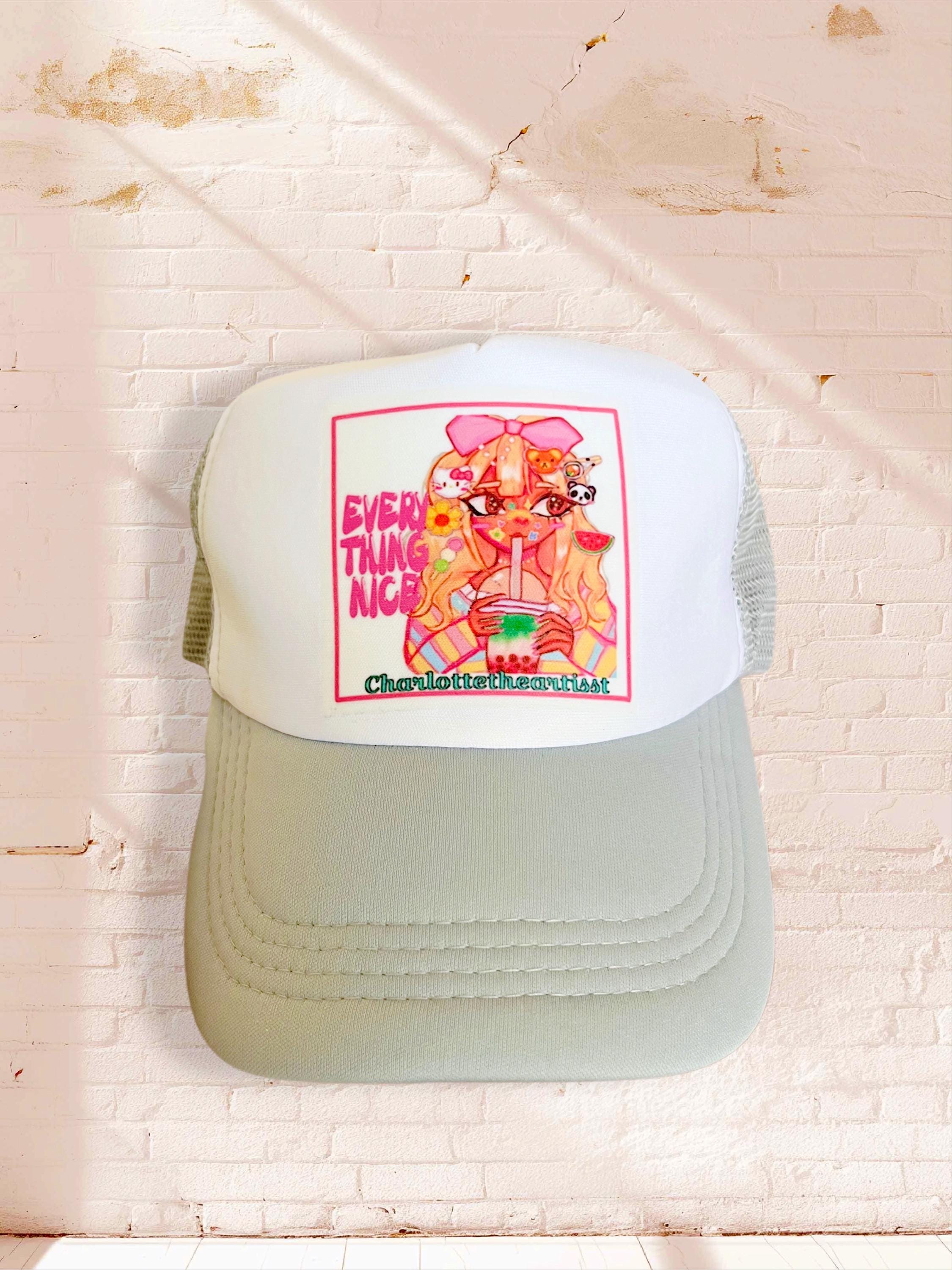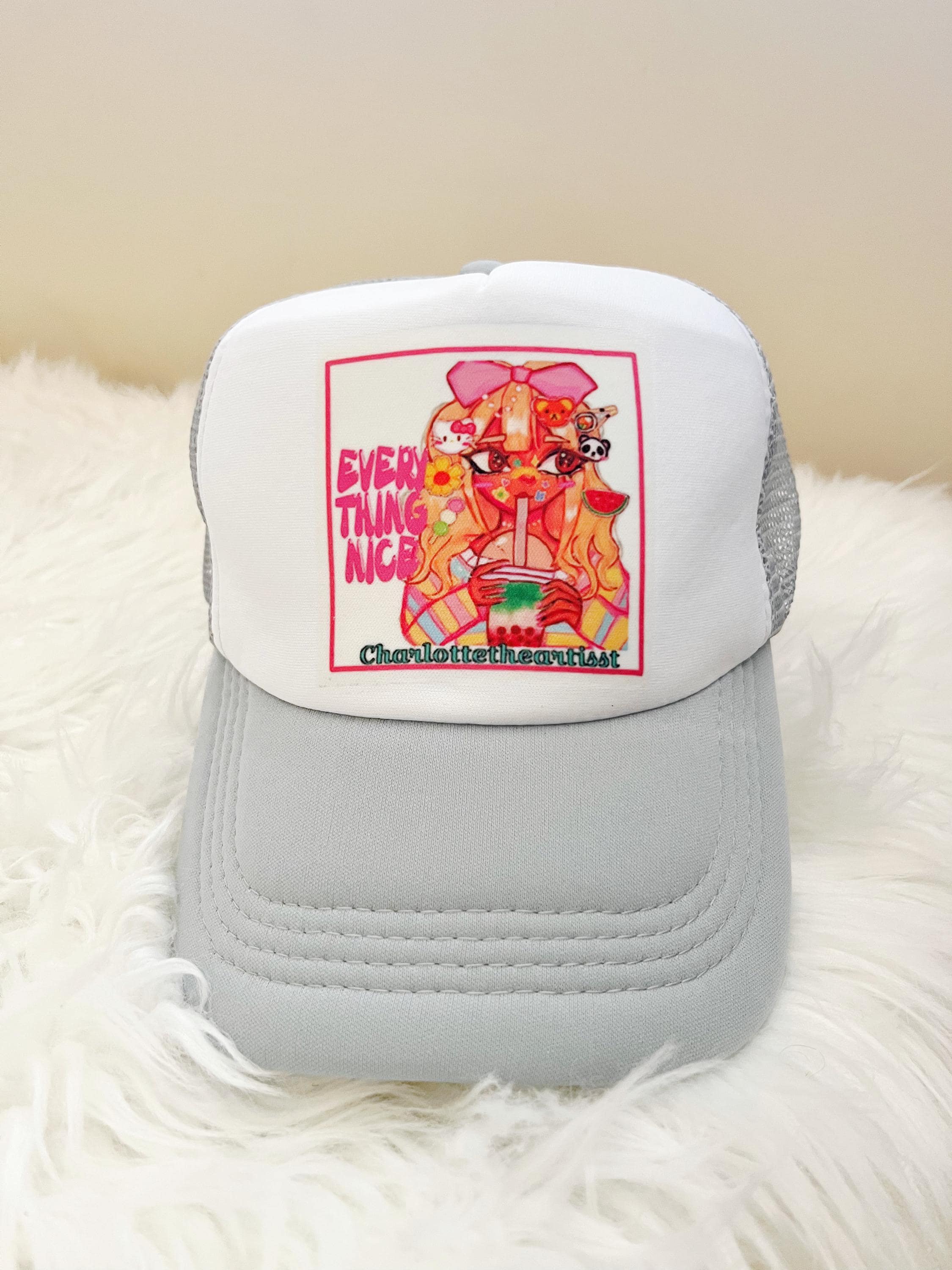 This listing is for (1) Mizuki Everything Nice Trucker SnapBack Mesh Cap. The cap feature my orginal art drawing of Mizuki (Everything Nice), which as been printed and heat pressed onto the cap. Cap is a light gray color.