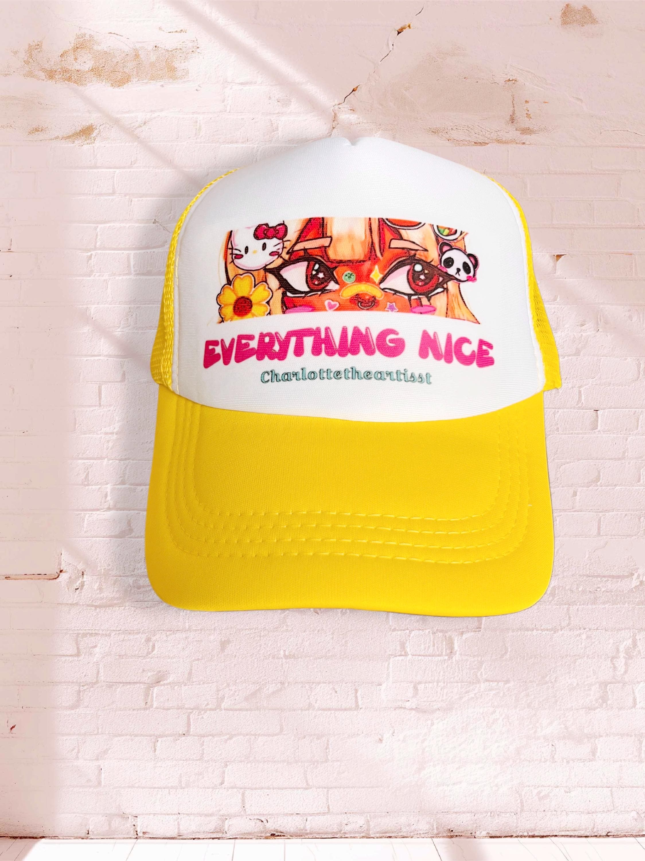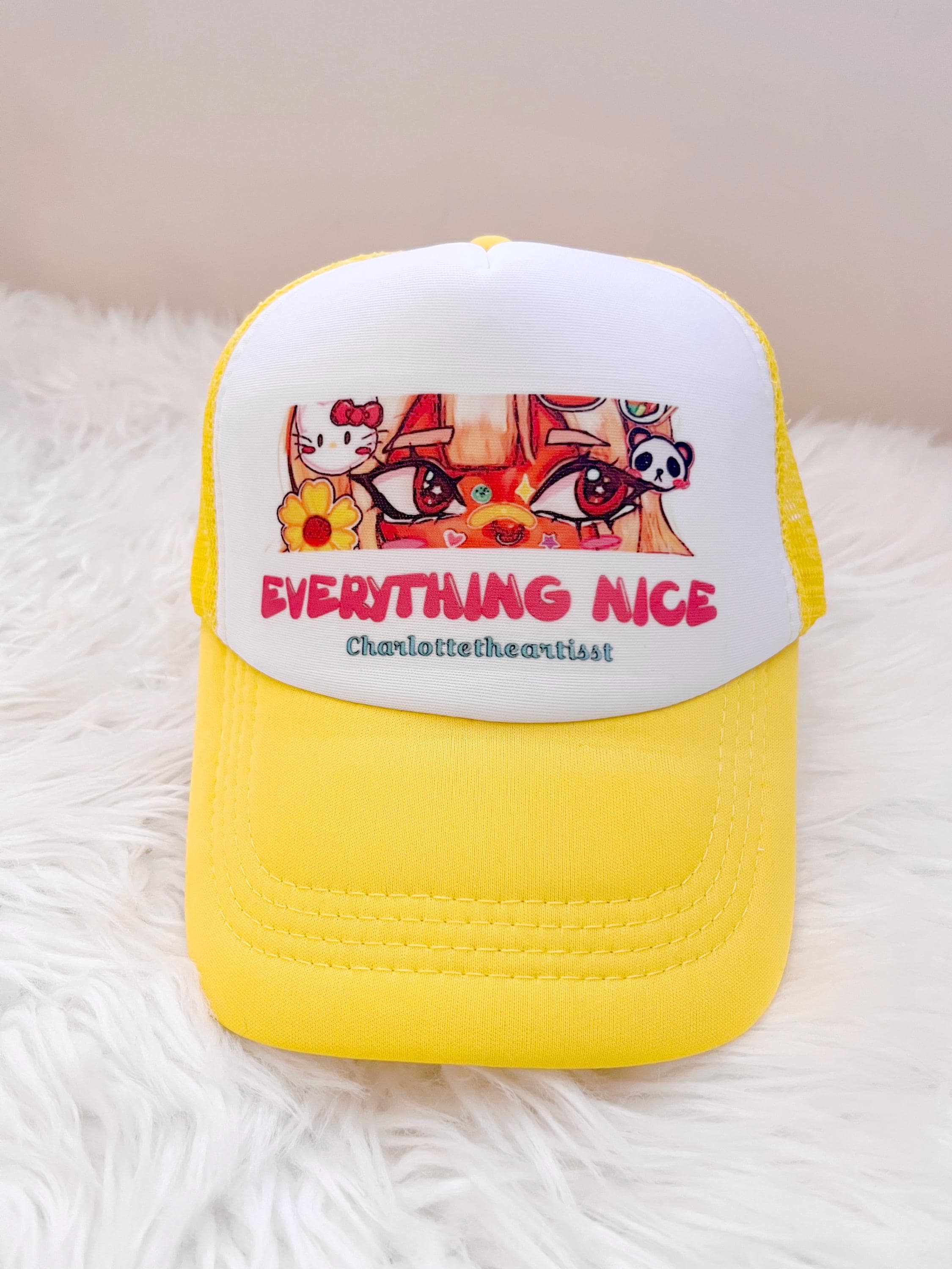 This listing is for (1) Mizuki Everything Nice Trucker SnapBack Mesh Cap. The cap feature my orginal art drawing of Mizuki (Everything Nice) Cropped Eyes Version, which as been printed and heat pressed onto the cap. Cap is a bright yellow color.