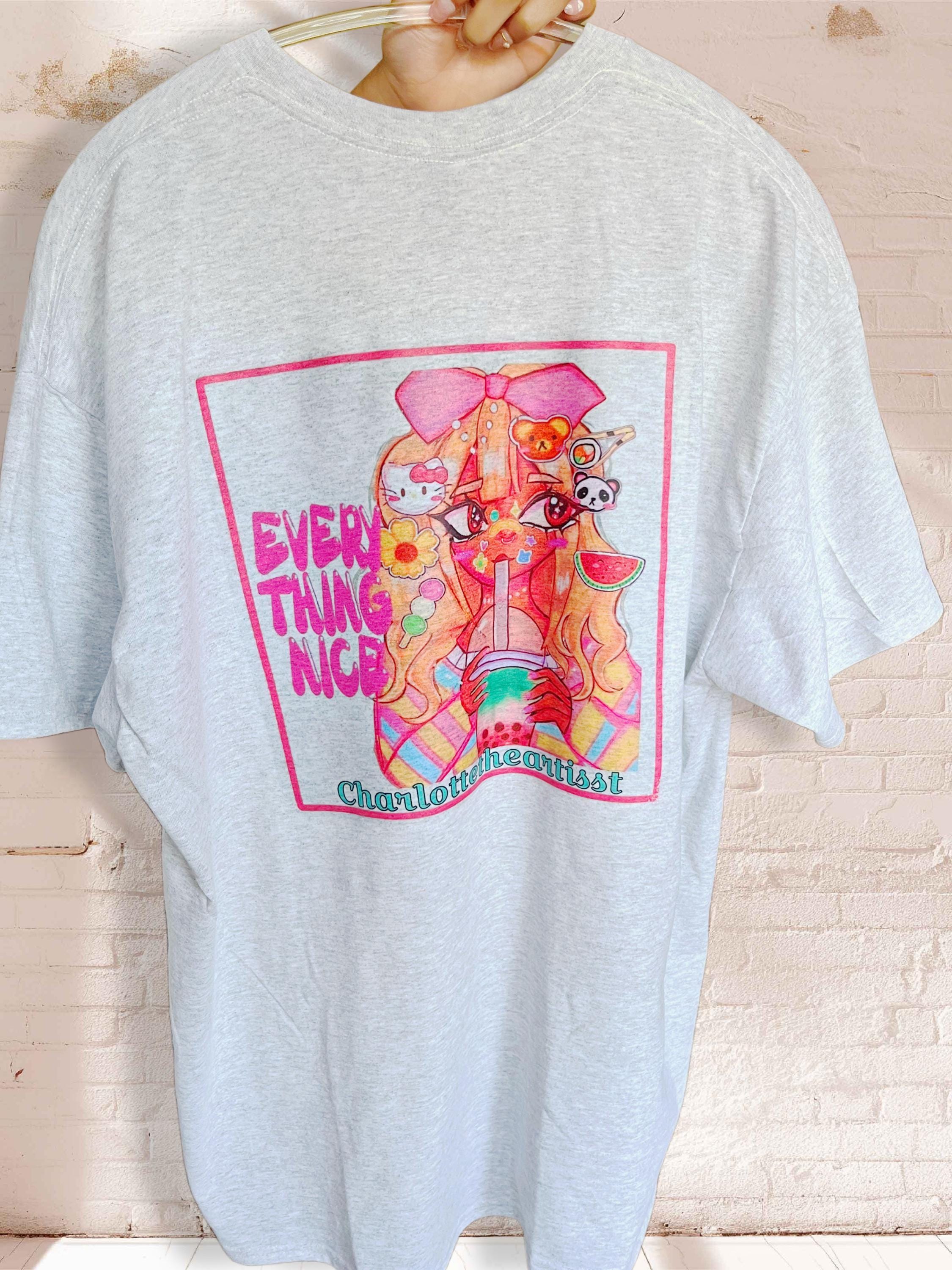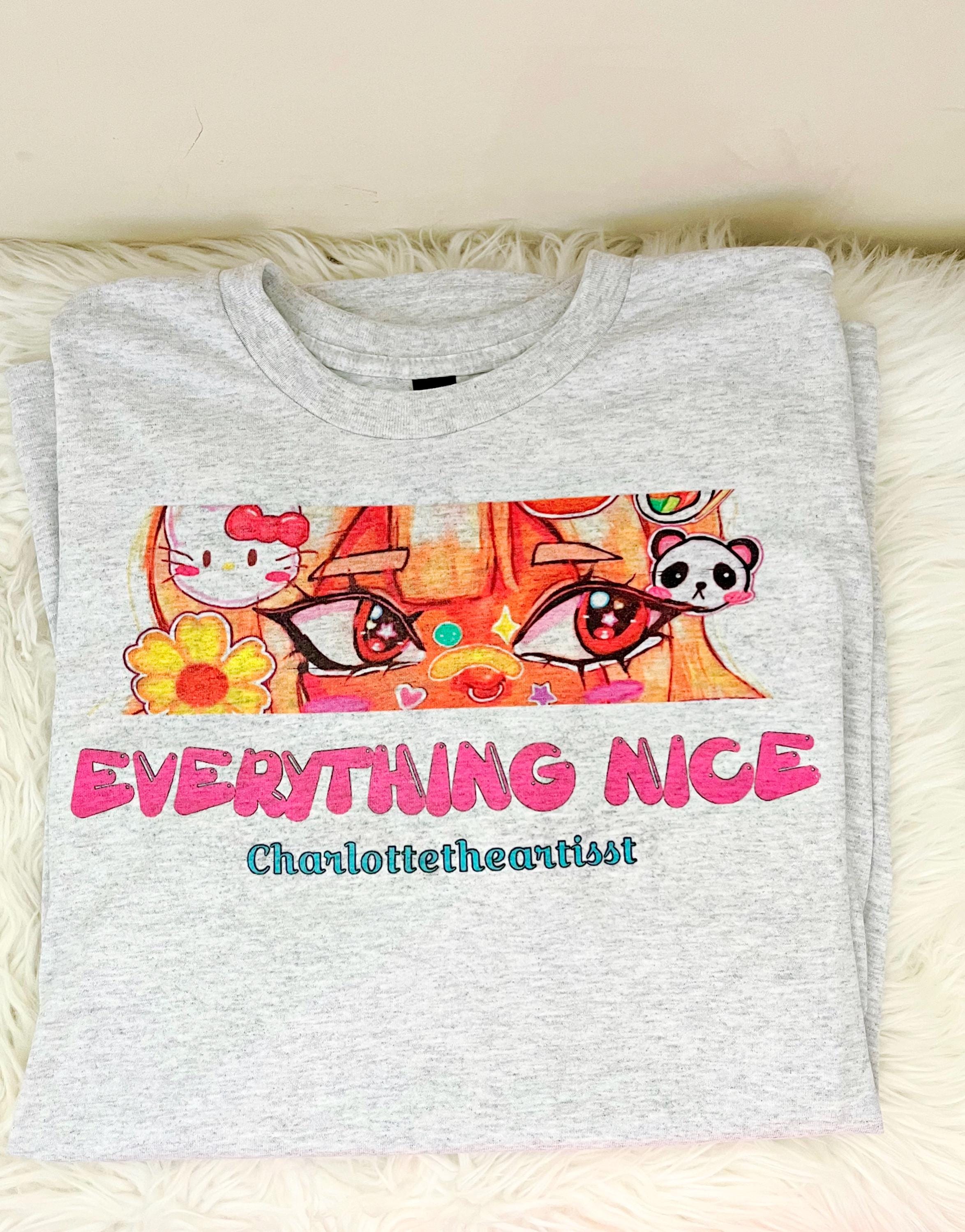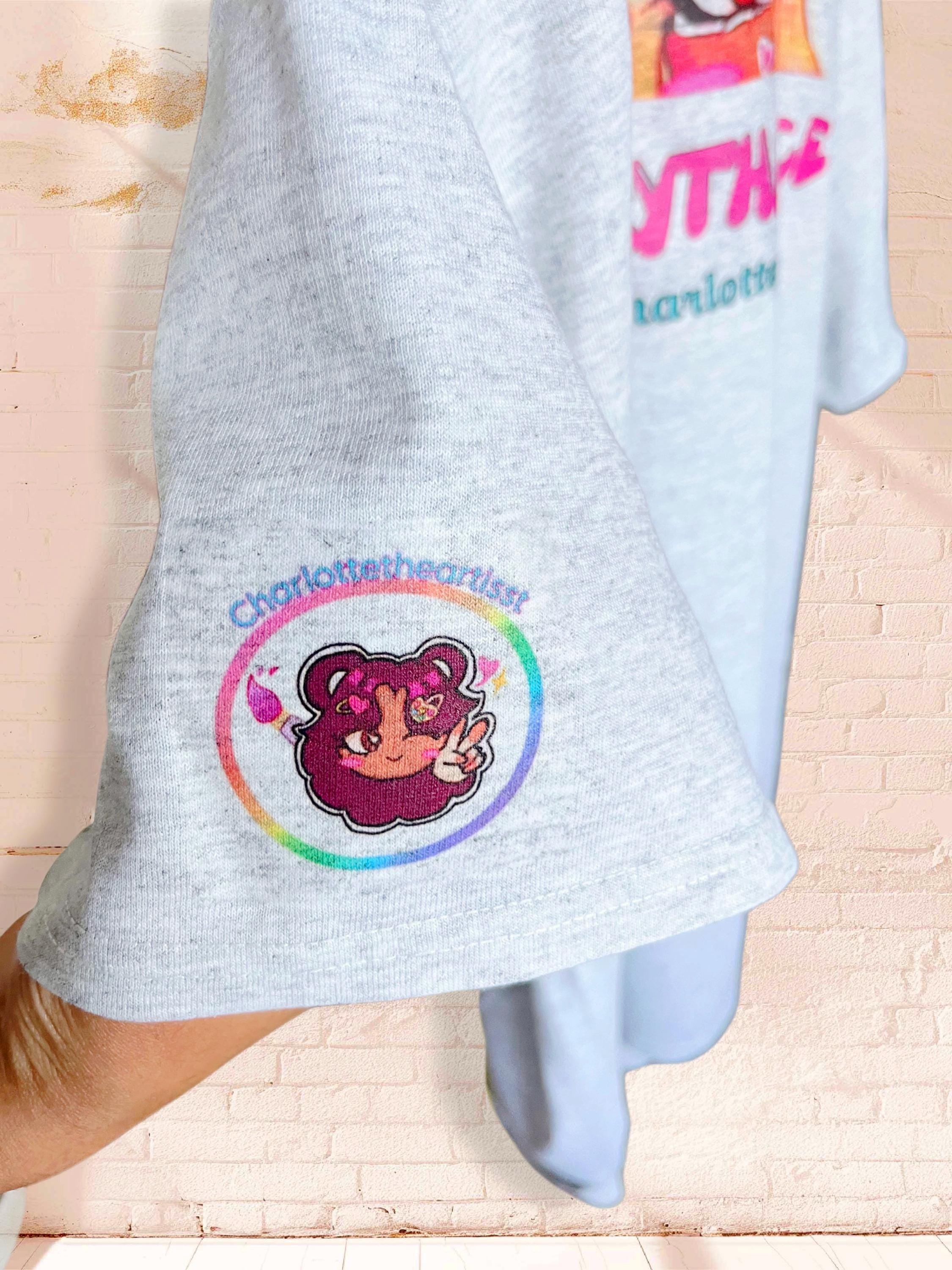 Mizuki is an original character and drawing that I created for an upcoming story I am writing. She is known for her colorful outfits and accessories. The front of t-shirt features a cropped version of Mizuki's eyes and hair accessories as well as my artist tag. The back of t-shirt features the full size drawing along with my artist handle. The right sleeve shows my logo.
